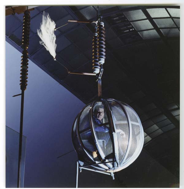 Demonstration in der Abteilung Starkstromtechnik des Deutschen Museums: Faradayscher Käfig. (Archiv des Deutschen Museums)