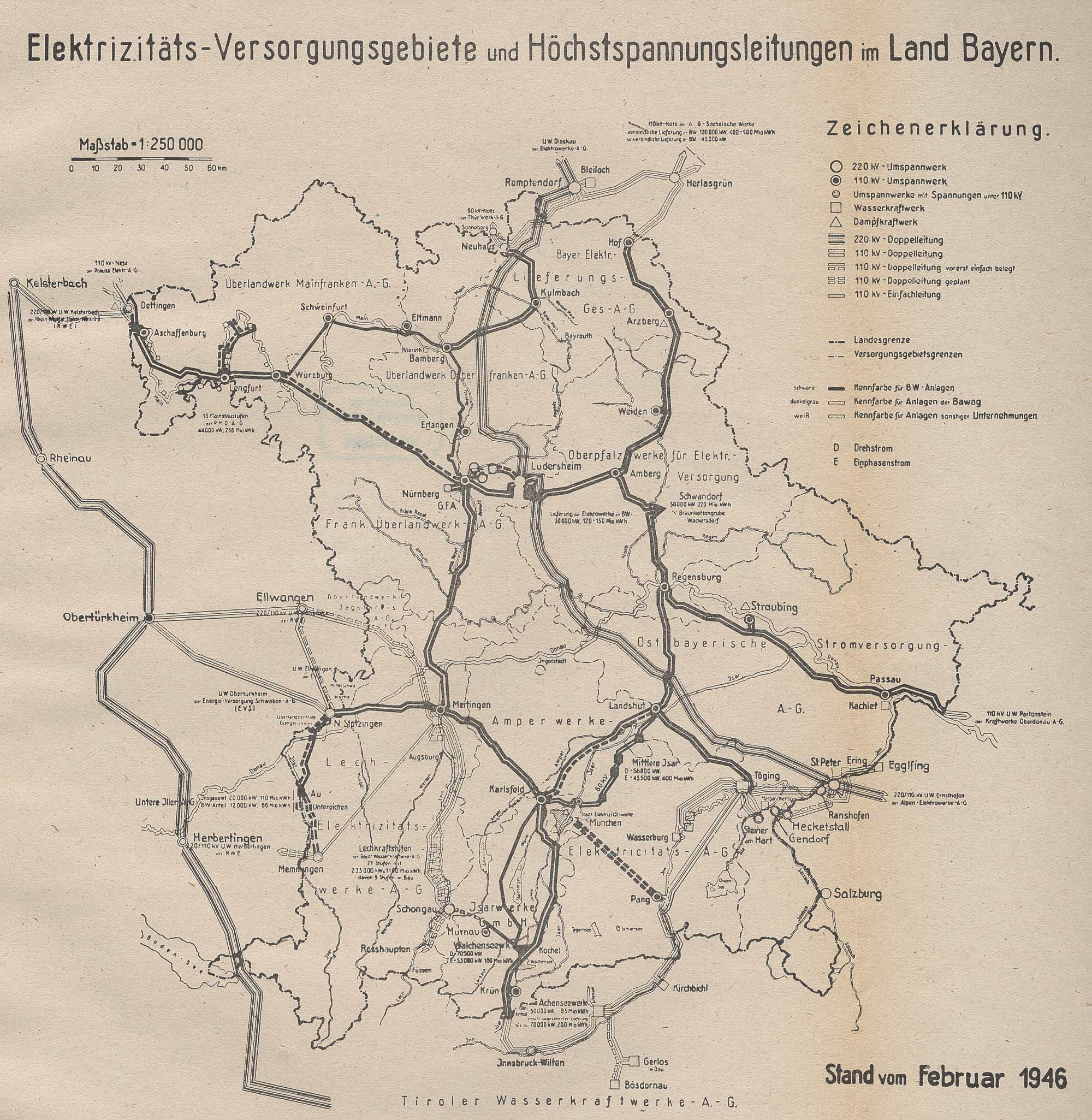 Elektrizitäts-Versorgungsgebiete und Höchstspannungsleitungen im Land Bayern. Stand vom Februar 1946 (aus: 25 Jahre Bayernwerk, München 1946, nach 16)