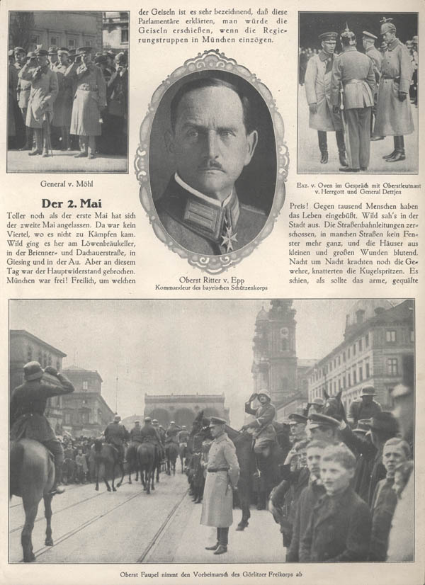Obwohl seinem Freikorps bei der Rückeroberung Münchens nicht die zentrale Rolle zukam, rückt die Seitengestaltung des Ende 1919 erschienenen Fotoberichts des späteren Hitler-Fotografen Heinrich Hoffmann (1885-1957) Franz Ritter von Epp (1868-1947)in den Mittelpunkt. (Ein Jahr bayrische Revolution im Bilde, München 1919, 31)