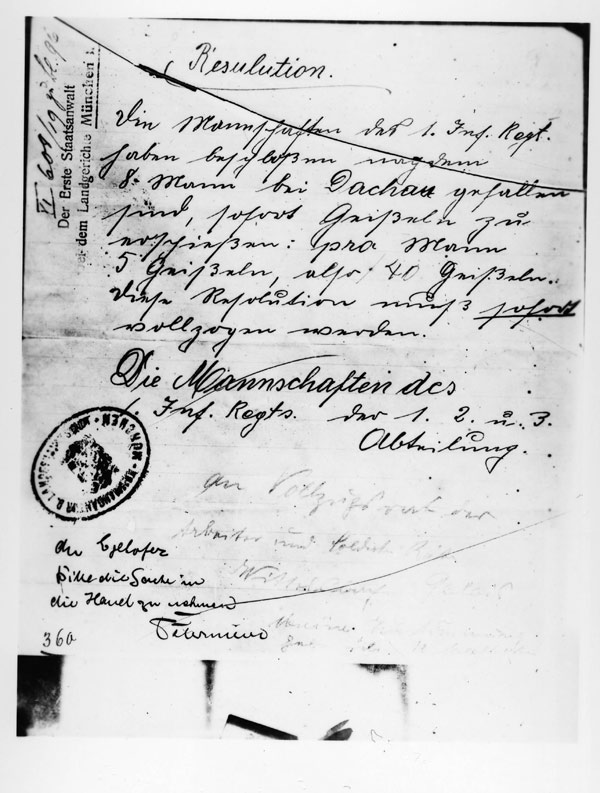 Forderung nach der Erschießung von Geiseln durch Soldaten des 1 Infanterieregiments, mit Weiterleitungsvermerken an den Vollzugsrat und an Egelhofer [Bayerische Staatsbibliothek, BildarchivHoffmann]