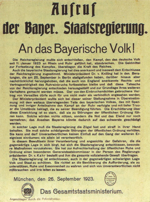 Einsetzung des Generalstaatskommissars Gustav von Kahr, 26. September 1923. (Bayerisches Hauptstaatsarchiv, Plakatsammlung 1331)