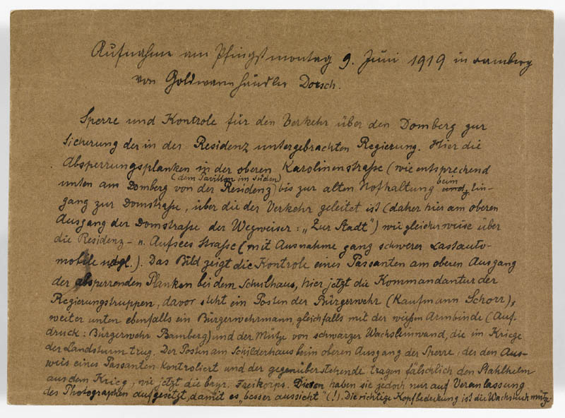 Wachtposten der Bamberger Bürgerwehr sichern den Bamberger Domberg, wo Regierung und Landtag in der Neuen Residenz untergebracht sind. Aufschlussreich sind die Bemerkungen auf der Rückseite des Fotos: Die Posten an der Schranke trugen ebenfalls nur eine Wachtmütze. Den Stahlhelm setzten sie auf Wunsch des Fotografen aus, damit es "besser aussieht". (Staatsbibliothek Bamberg, V Bxb 59)