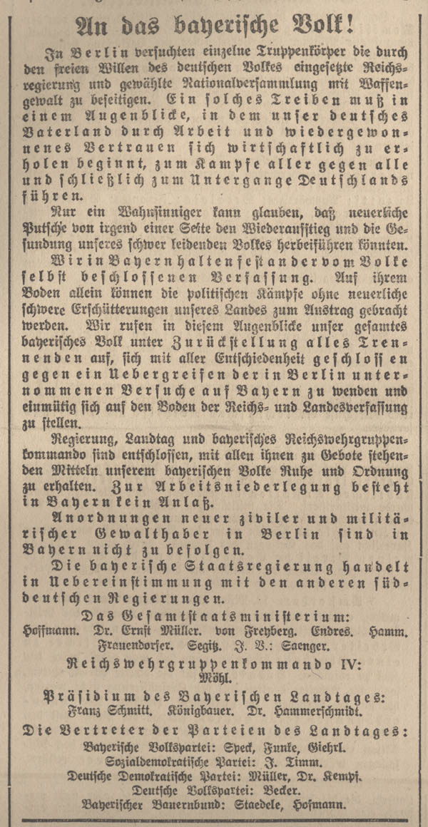 Aufruf "An das bayerische Volk" der Staatsregierung, des Reichswehrgruppenkommandos, des Landtagspräsidiums und der im Landtag vertretenen Parteien, veröffentlicht am Sonntag, 14. März 1920. (aus: Bayerische Staatszeitung 8 [1920], Nr. 62)