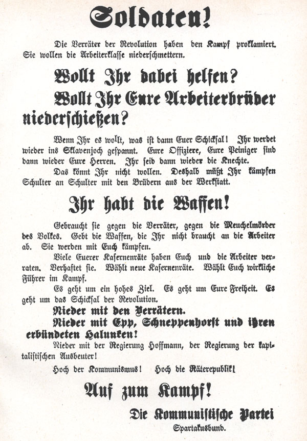 Flugblatt von KPD/Spartakusbund vom 23. April 1919, Aufruf an die Soldaten zur Verteidigung der Räterepublik. (Monacensia. Literaturarchiv und Bibliothek München, F. Mon. 2636)