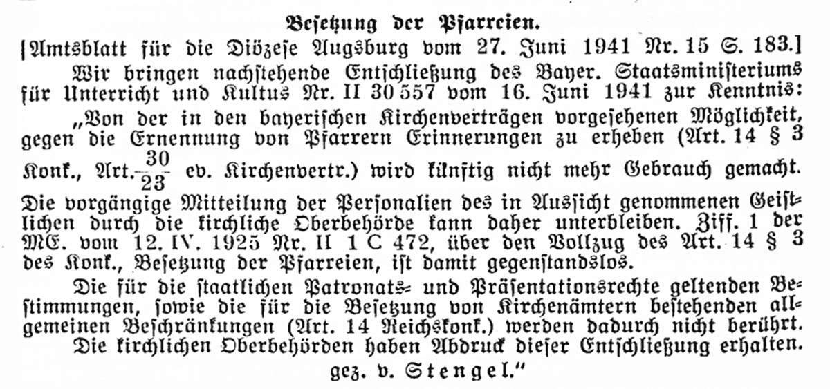 Am 16. Juni 1941 verzichtete der Freistaat Bayern darauf, gegen die Ernennung von Pfarrern "Erinnerungen" abzugeben. (Pfarramtsblatt 20 [1941], 80)