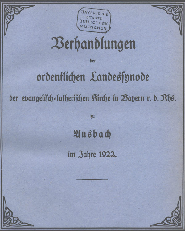 Verhandlungen der ordentlichen Landessysnode der evangelisch-lutherischen Kirche in Bayern rd Rhs zu Ansbach im Jahre 1922[Titelblatt]