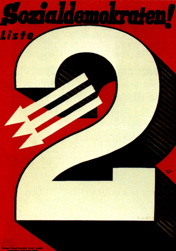 Das Plakat der SPD zur Reichstagswahl am 6 November 1932 zeigt nur die überdimensionale Listennummer und das sozialdemokratische Parteisymbol, die drei parallelen Pfeile [Bayerisches Hauptstaatsarchiv,Plakatsammlung]