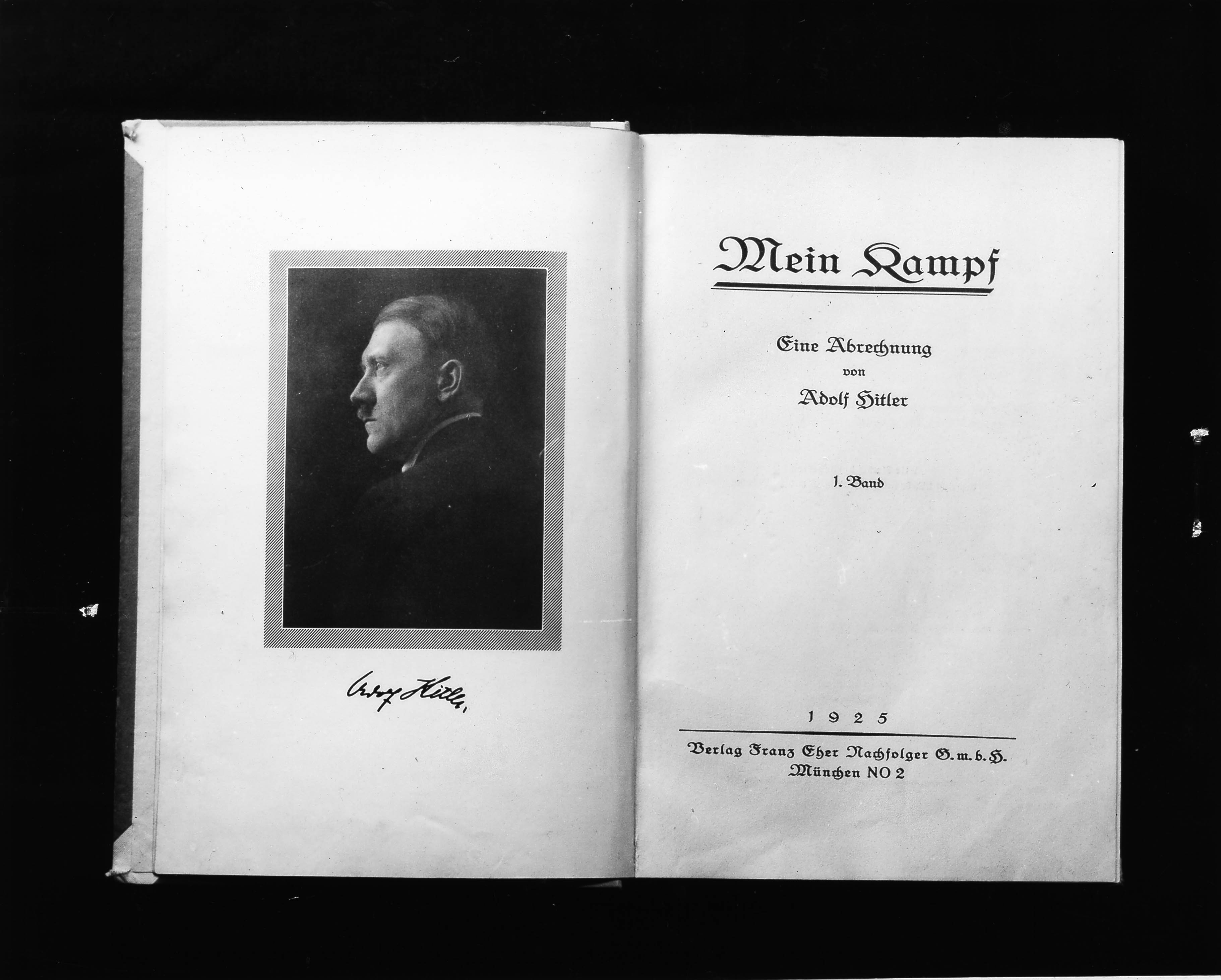 Titelblatt der Erstauflage von "Mein Kampf" (1925), mit Brustbild Hitlers. (Bayerische Staatsbibliothek, Bildarchiv hoff-6658)