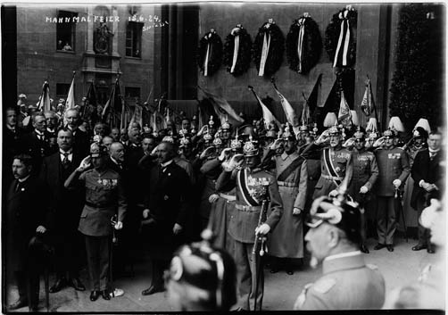 Mahnmalfeier am 15 Juni 1924 an der Feldherrnhalle am Münchner Odeonsplatz, in der Mitte Kronprinz Rupprecht von Bayern, salutierend [Bayerische Staatsbibliothek, FotoarchivHoffmann]