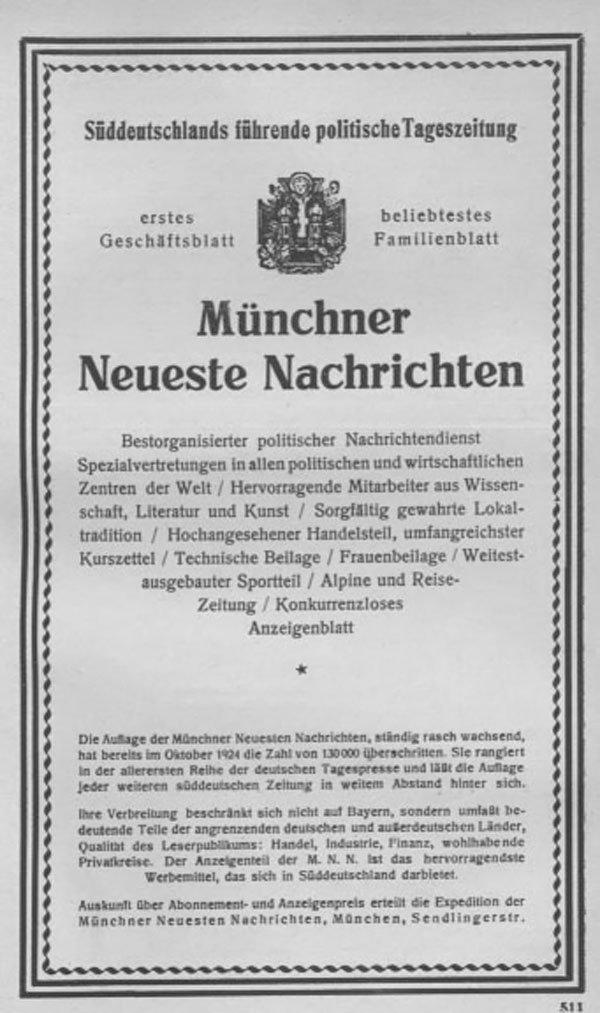 Anzeige der Münchner Neuesten Nachrichten 1925. (aus: Jahrbuch der bayerischen Wirtschaft 1925, 511)