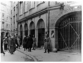Hitlerputsch, 9. November 1923, Stoßtrupp Hitler vor dem Verlagsgebäude der Münchener Post. (Bayerische Staatsbibliothek, Fotoarchiv Hoffmann)