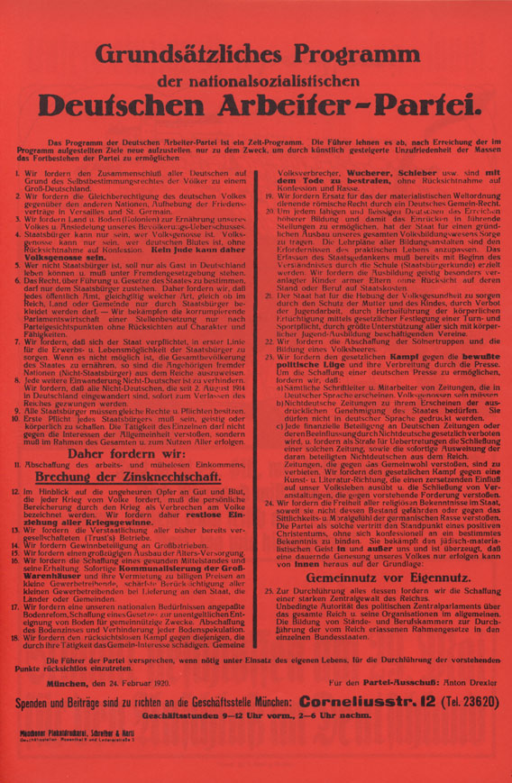 Grundsatzprogramm der NSDAP mit den 25 Thesen, die Hitler auf der ersten Massenversammlung der Partei am 24. Februar 1920 im Münchner Hofbräuhaus vortrug. (Bayerisches Hauptstaatsarchiv, Plakatsammlung)