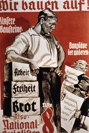 Plakat der NSDAP zur Reichstagswahl am 31. Juli 1932: "Wir bauen auf". (Bayerische Staatsbibliothek, Fotoarchiv Hoffmann)