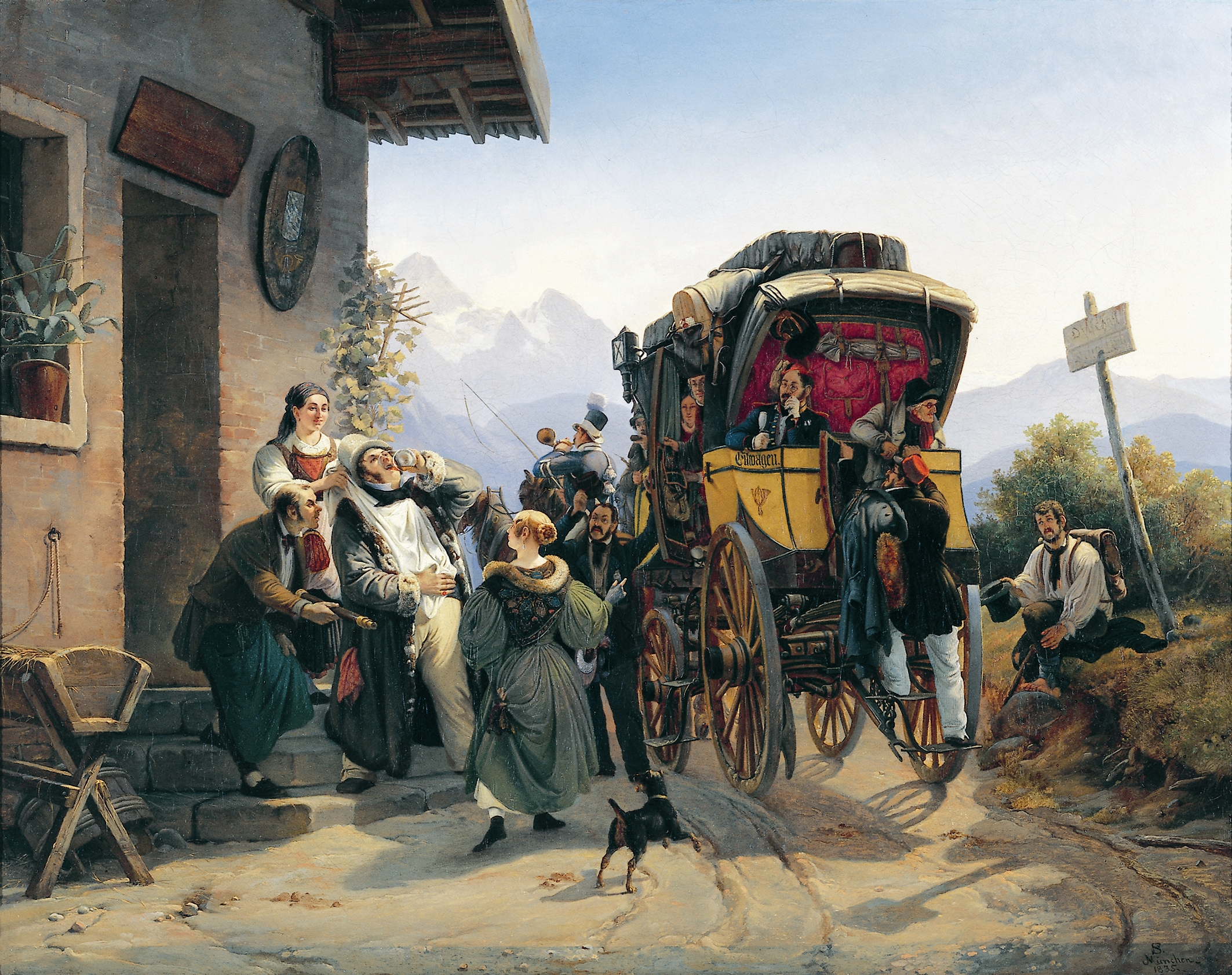 Niels Simonsen, Abfahrt einer bayerischen Eilpostkutsche. Öl auf Leinwand, 1835; dem Bild sind zahlreiche Details des Eilpostwagens bis hin zur neuartigen Federungstechnik zu entnehmen. Die Szene illustriert auch die neue soziale Realität des Reisens. (Museumsstiftung Post und Telekommunikation, Foto: Axel Schneider)