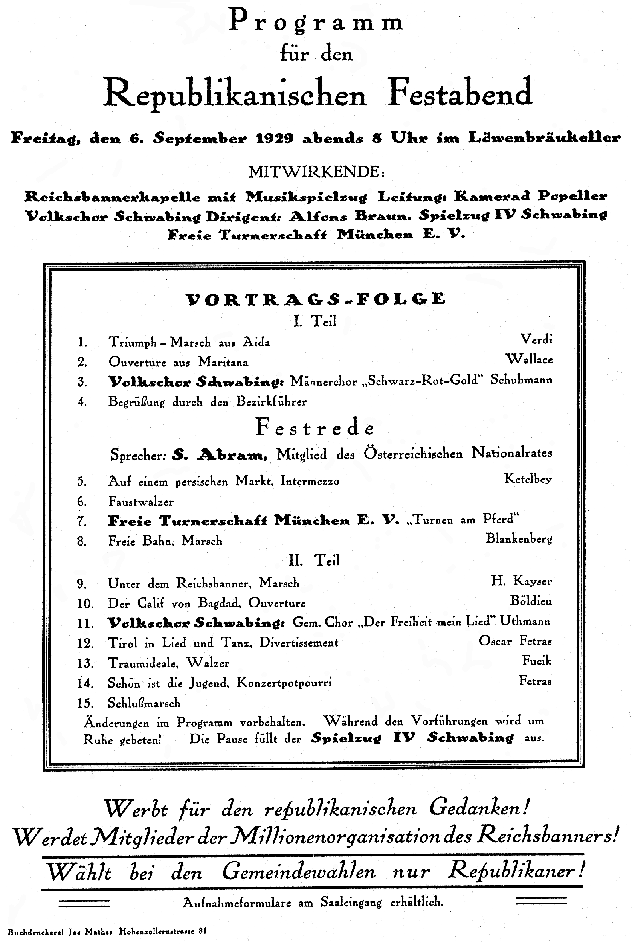 Programmzettel des "Republikanischen Festabends" im Löwenbräukeller, München, vom 6. September 1929. (Staatsarchiv München)