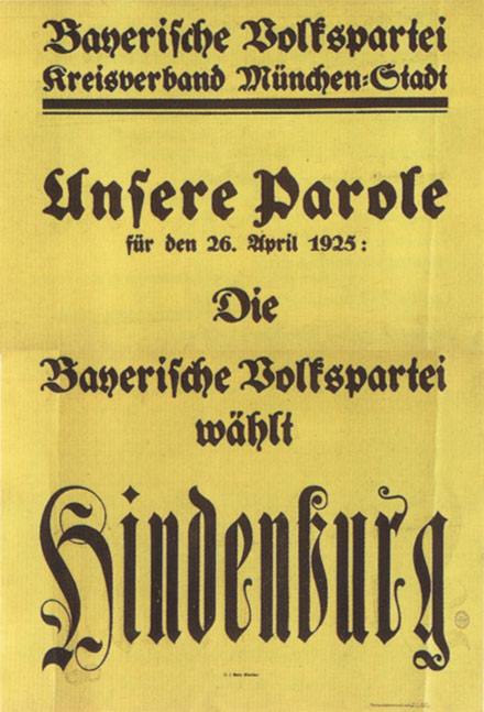 "Die Bayerischen Volkspartei wählt Hindenburg", Wahlplakat der BVP zur Reichspräsidentenwahl 1925, zwischen 29. März und 26. April 1925. (Bayerisches Hauptstaatsarchiv, Plakatsammlung 8671)
