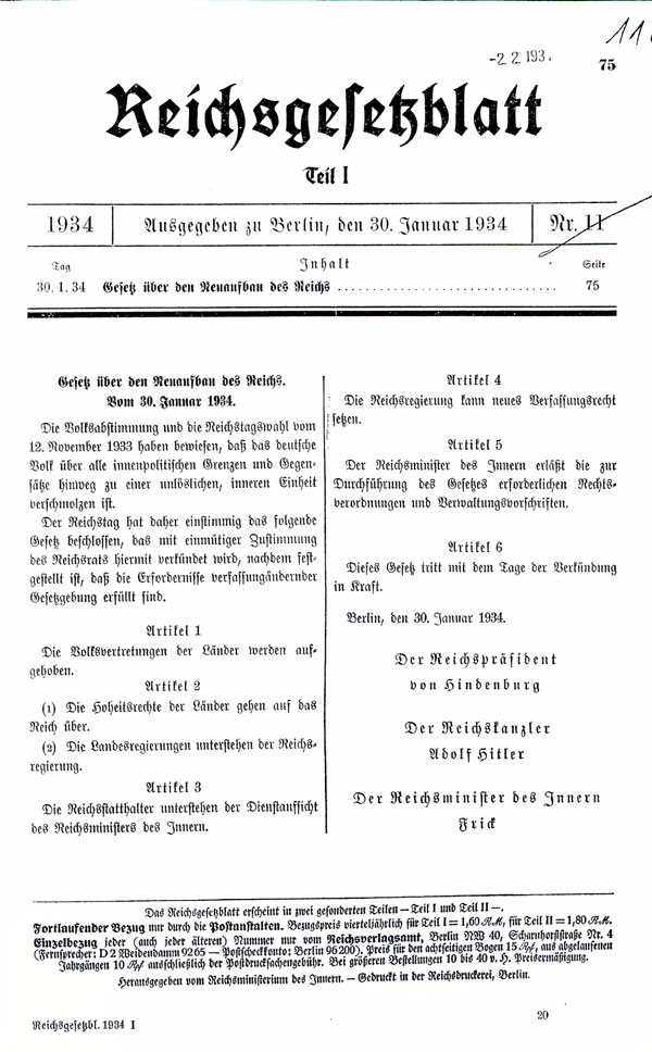 Gesetz über den Neuaufbau des Reichs, 30. Januar 1934. (Reichsgesetzblatt 1934, I, 75)
