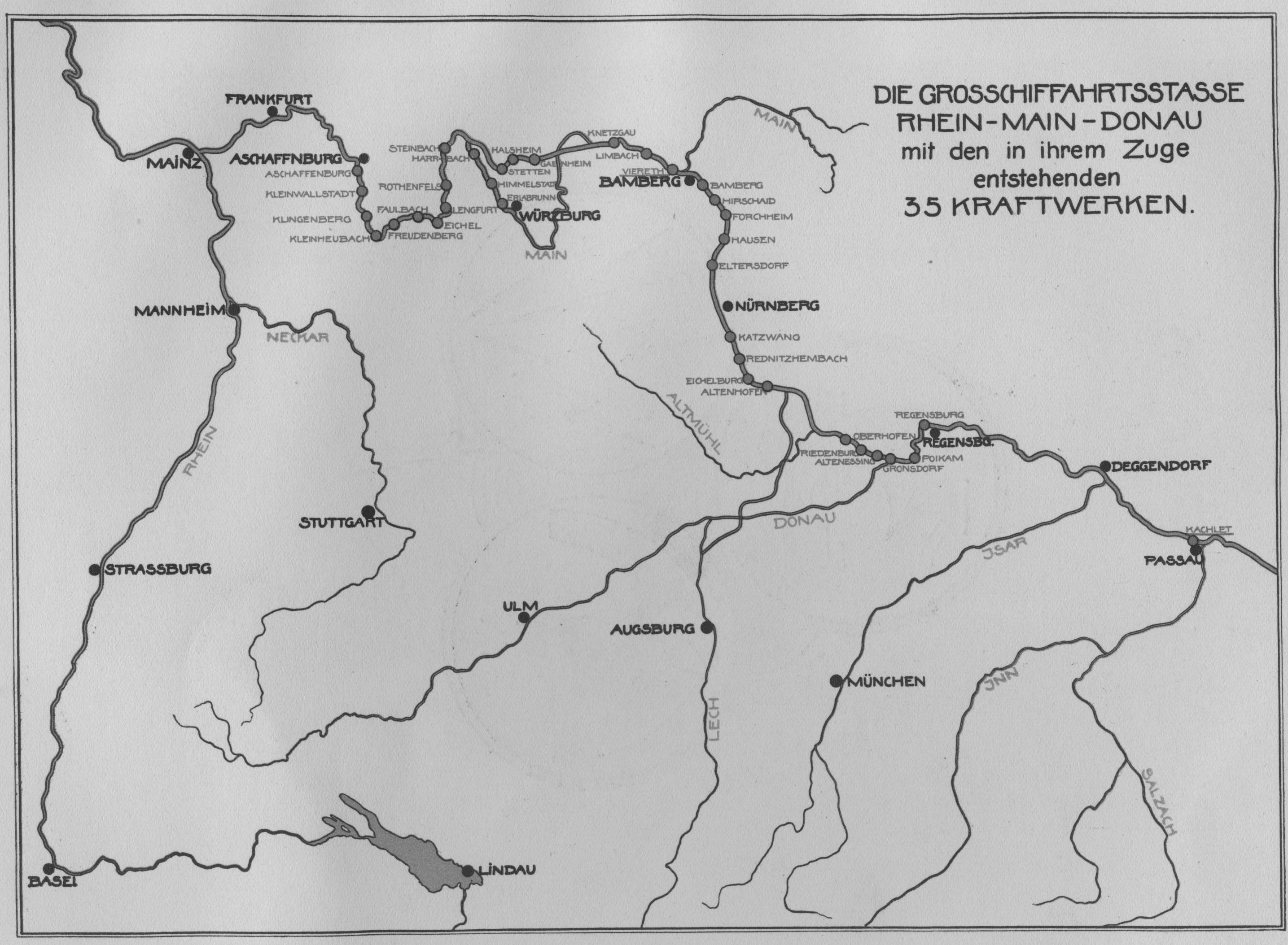 Plan der Rhein-Main-Donau- Großschifffahrtsstraße und der dort zu errichtenden Kraftwerke. Die Planungen sehen noch einen Durchstich der Mainschleife vor. (aus: Werke der Rhein-Main-Donau Aktiengesellschaft München und der Betriebsgemeinschaft Kachlet-Franken G.m.b.H., Nürnberg 1921-1925, Hintersatz)