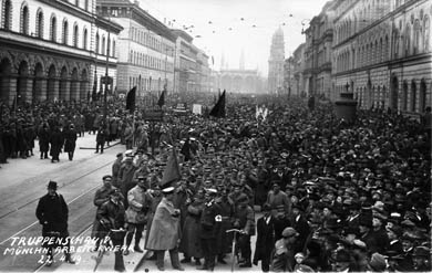 Truppenschau der Roten Armee am 22. April 1919. Zu sehen ist die Ludwigstraße, mit Blick nach Süden auf die Feldherrnhalle. Links im Bild das Kriegsministerium. (Bayerische Staatsbibliothek, Fotoarchiv Hoffmann)