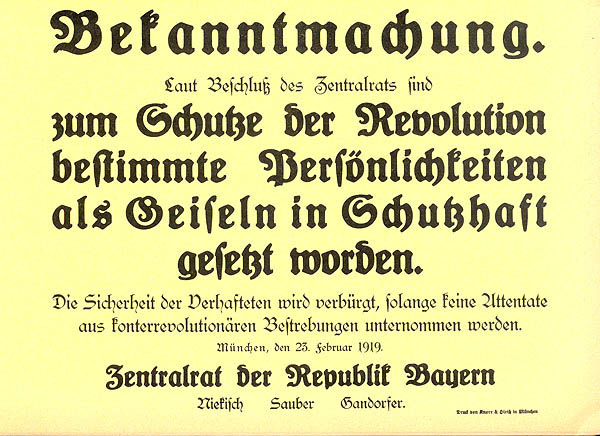 Erste Geiselnahmen (Schutzhaft) nach der Ermordung Eisners. Bekanntmachung des Zentralrats der Republik Bayern vom 23. Februar 1919. (Monacensia. Literaturarchiv und Bibliothek)