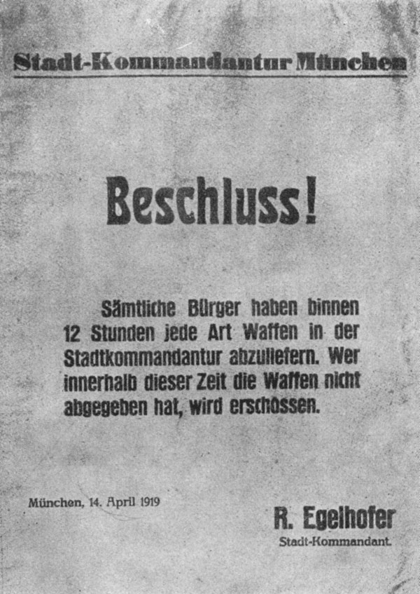 Von Stadtkommandant Rudolf Egelhofer (1896-1919) unterzeichneter Befehl vom 14. April, der das Münchner Bürgertum aufforderte, jedwede Waffen in der Stadtkommandatur abzuliefern. Abb. aus: Erich Wollenberg, Als Rotarmist vor München. Reportage aus der Münchener Räterepublik, Berlin 1929, Abbildungsteil. (Bayerische Staatsbibliothek, P.o.germ. 1724-3)