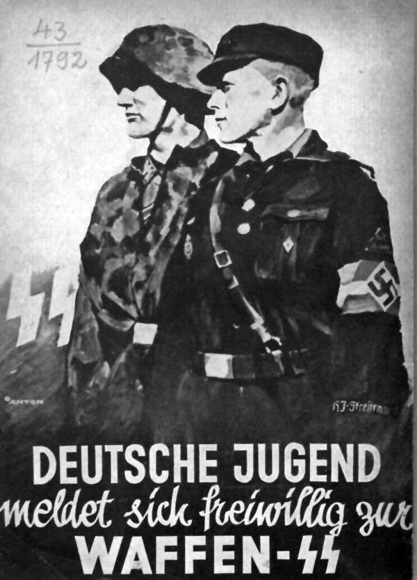 "Deutsche Jugend meldet sich freiwillig zur Waffen-SS". Titelblatt einer Propaganda-Broschüre, München [1942]. (Bayerische Staatsbibliothek, 43.1792)