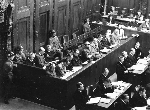 Anklagebank beim Prozess gegen die Angehörigen des SS-Rasse- und Siedlungshauptamts 1947/48 in Nürnberg. (Bayerische Staatsbibliothek, Fotoarchiv Hoffmann)