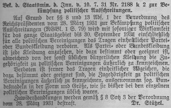 Wortlaut des allgemeinen Uniformverbots lt Erlass des bayerischen Innenministeriums, 10 Juli 1931 [Bayerische Staatszeitung, 11 Juli1931]