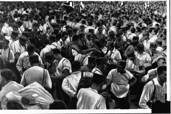 SA-Kundgebung 1932; demonstratives Ausziehen des Braunhemdes nach dem Uniformverbot. (Bayerische Staatsbibliothek, Bildarchivhoff-7166)
