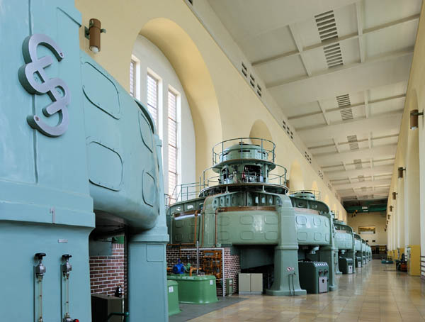 Generatorenraum des Kraftwerks Kachlet: Zu sehen sind die Generatoren der Fa. Siemens-Schuckertwerke, die etwa 300 Mio. kWh Jahresleistung Strom erzeugen. (Bildrechte E.ON Wasserkraft GmbH, Bildautor Rolf Sturm)