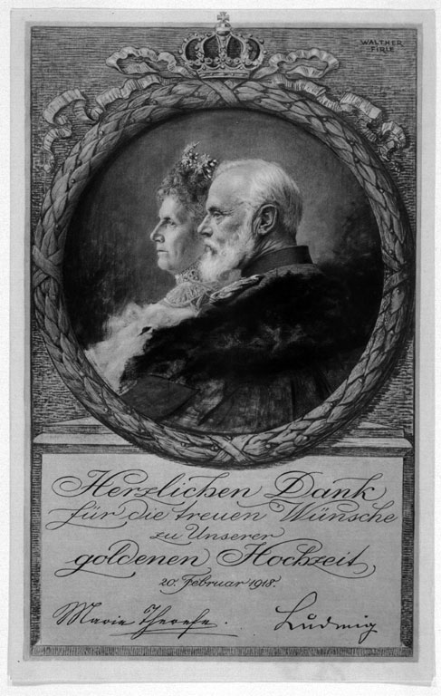 König Ludwig III. von Bayern (1845-1921, reg. 1912/13-1918) mit Gemahlin Marie Therese (1849-1919). Dankpostkarte für Glückwünsche zur Goldenen Hochzeit am 20. Februar 1918. (Regensburger Porträtgalerie, 9994/PoS KF Nr. 1101)