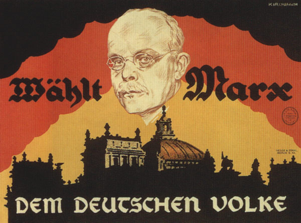 Plakat zur Reichspräsidentenwahl im März/April 1925; das Zentrum stellte mit dem Vorsitzenden Wilhelm Marx einen eigenen Kandidaten auf, der jedoch nicht gewählt wurde. Der Kopf des Politikers schwebt vor einem schwarz-rot-goldenen Hintergrund über dem Reichstagsgebäude in Berlin und soll das Bekenntnis der Partei zur Weimarer Republik verdeutlichen. (Bayerisches Hauptstaatsarchiv, Plakatsammlung)
