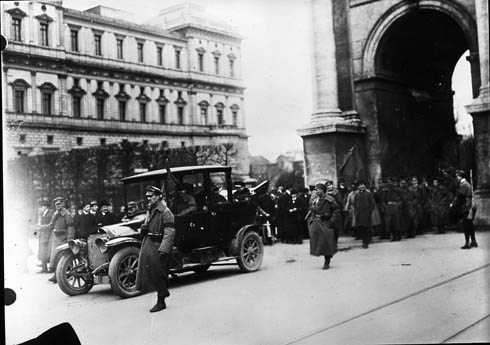 Truppenschau der Roten Armee am 22. April 1919 in München, Siegestor/Leopoldstraße. (Bayerische Staatsbibliothek, Bildarchiv, hoff-5146)