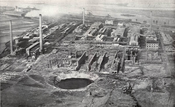 Die Explosionskatastrophe vom 21. September 1921 zerstörte das Werk Oppau und mehrere Orte der Umgebung. Der durch die Explosion entstandene Krater war 125 m lang, 90 m breit und 19 m tief. (aus: Bayerisches Staatskommissariat für das Hilfswerk Oppau [Hg.], Denkschrift über die Tätigkeit des Hilfswerks Oppau, Neustadt an der Hardt 1925, Abb. 1)