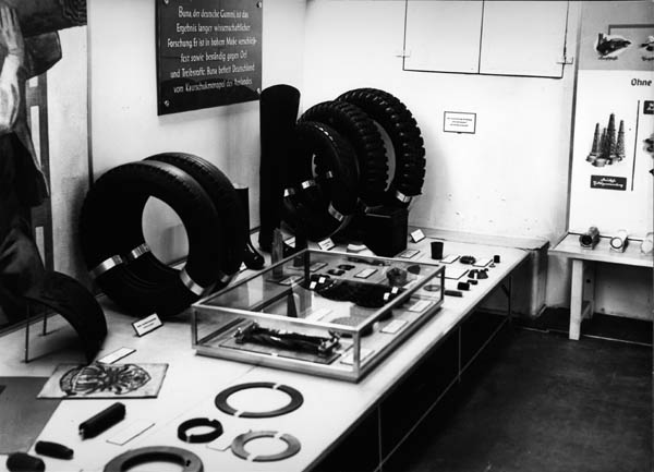 "Buna, der deutsche Gummi, ist das Ergebnis langer wissenschaftlicher Forschung...". Exponate bei der Ausstellung Vierjahresplan 1939 in Wien. (Bayerische Staatsbibliothek, Bildarchiv, hoff-41420)