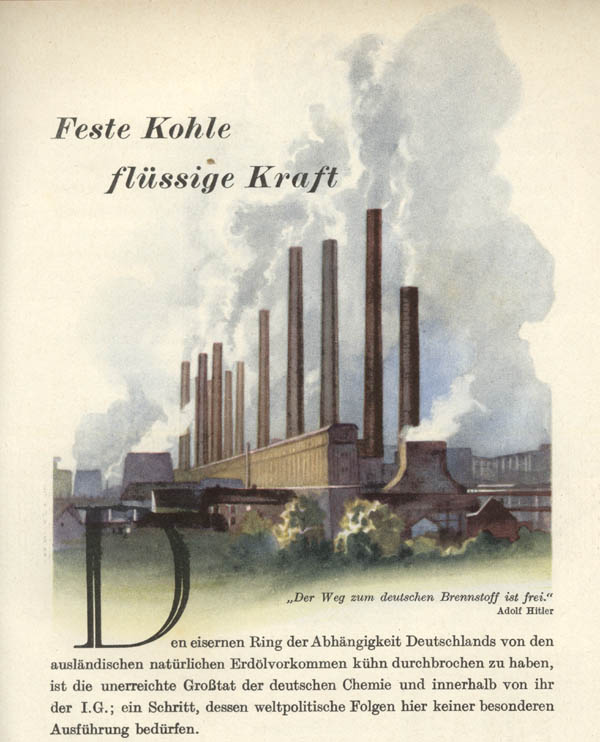 Das Werk Leuna der BASF, in dem die IG Farben synthetisches Benzin aus Braunkohle herstellte, dargestellt in einem Unternehmensporträt der IG Farben. Das "Leuna-Benzin" oder "Deutsche synthetische Benzin" besaß für die Autarkiebestrebungen der Nationalsozialisten eine hohe Bedeutung, wie das der Abbildung unterlegte Zitat von Adolf Hitler (1889-1945) zeigt. (aus: I.G. Farben [Hg.], Erzeugnisse unserer Arbeit, Frankfurt am Main 1938, 177)