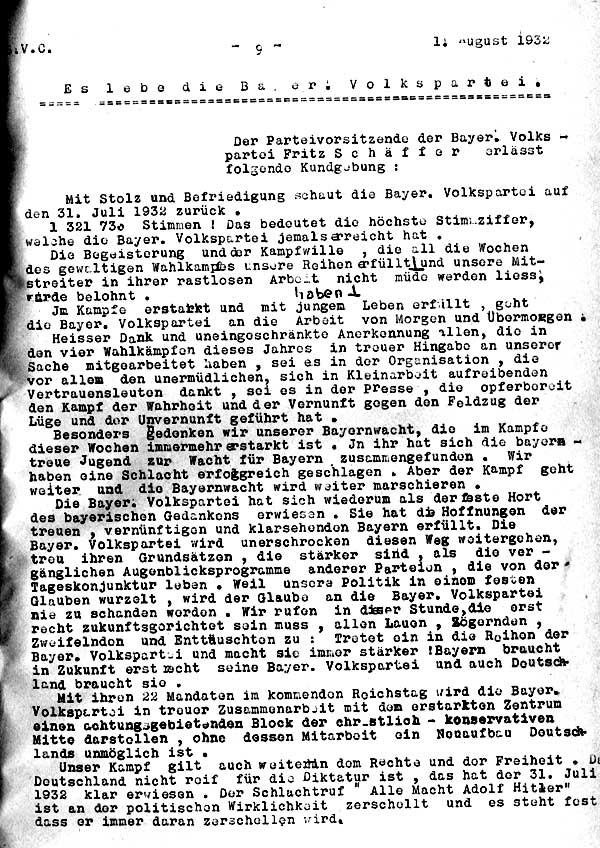 Bayerische Volkspartei-Corresspondenz vom 1. August 1932; Auszug aus einer Verlautbarung des BVP-Vorsitzenden Fritz Schäffer (1888-1967) am Tag nach der Reichstagswahl (31. Juli 1932), bei der die BVP von 28% auf 29,15% zugelegt hatte.