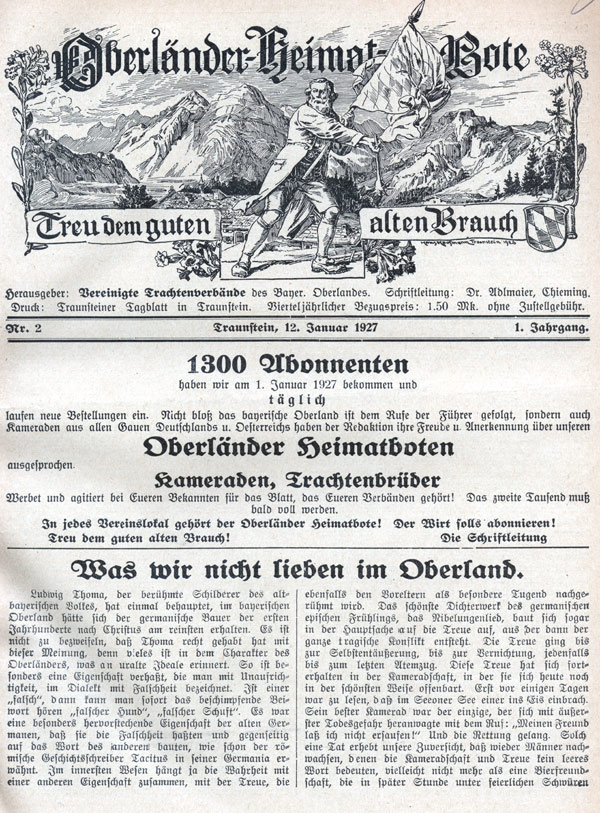 Titelblatt der Vereinszeitschrift Oberländer Heimat-Bote Die Titelillustration zeigt den legendären Schmied von Kochel vor den bayerischen Alpen im Hintergrund Die Darstellung des Schmieds lehnt sich an die früheste Bildquelle an, das Fresko von Wilhelm Lindenschmidt [1806-1848] an der Pfarrkirche in Sendling um1830