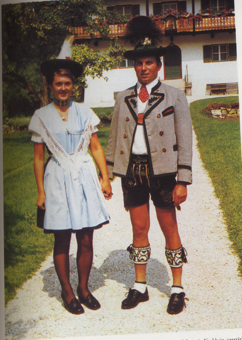 Zeitgenössische Einflüsse auf die Trachtenpflege: Das Foto aus Berchtesgaden von 1972 illustriert u a den Einfluss der Minirock-Mode auf die Frauentracht, auch der Schnitt der Lederhose ist an den Geschmack der 1970er Jahre angepasst [Trachten-Informations- Zentrum des BezirksOberbayern]