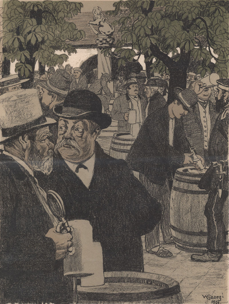 Karrikatur "Im Hofbräuhausgarten" von 1901. Originale Bildbeschriftung: "Ham Sie's g'sehgn? Der Berliner do hint'n krieagt jetzt scho dö viert Mass!!" - "Hab's scho g'sehg'n, Herr Nachba! Aba - unta uns g'sagt - so hat's kemma müass'n! Oa Reservatrecht um's andere geht schö' langsam zum Deifl!!". Abb. aus: Jugend 6 (1901), 659. (Bayerische Staatsbibliothek, 4 Per. 11i-6,2)