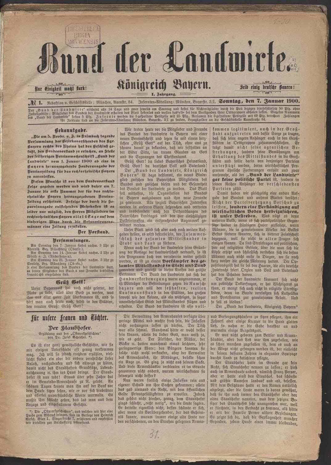 Titelblatt der Nr 1 der bayerischen Sonderausgabe der Vereinsschrift Bund der Landwirte vom 7 Januar1900