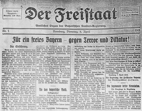 Der Freistaat Erstausgabe der Zeitung vom 8 April 1919 [BayerischeStaatsbibliothek]