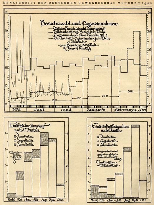 Statistiken zur Deutschen Gewerbeschau 1922: Besucherzahl und Tageseinnahmen, Eintrittskartenverkauf nach Monaten, Eintrittskarteneinnahme nach Monaten.