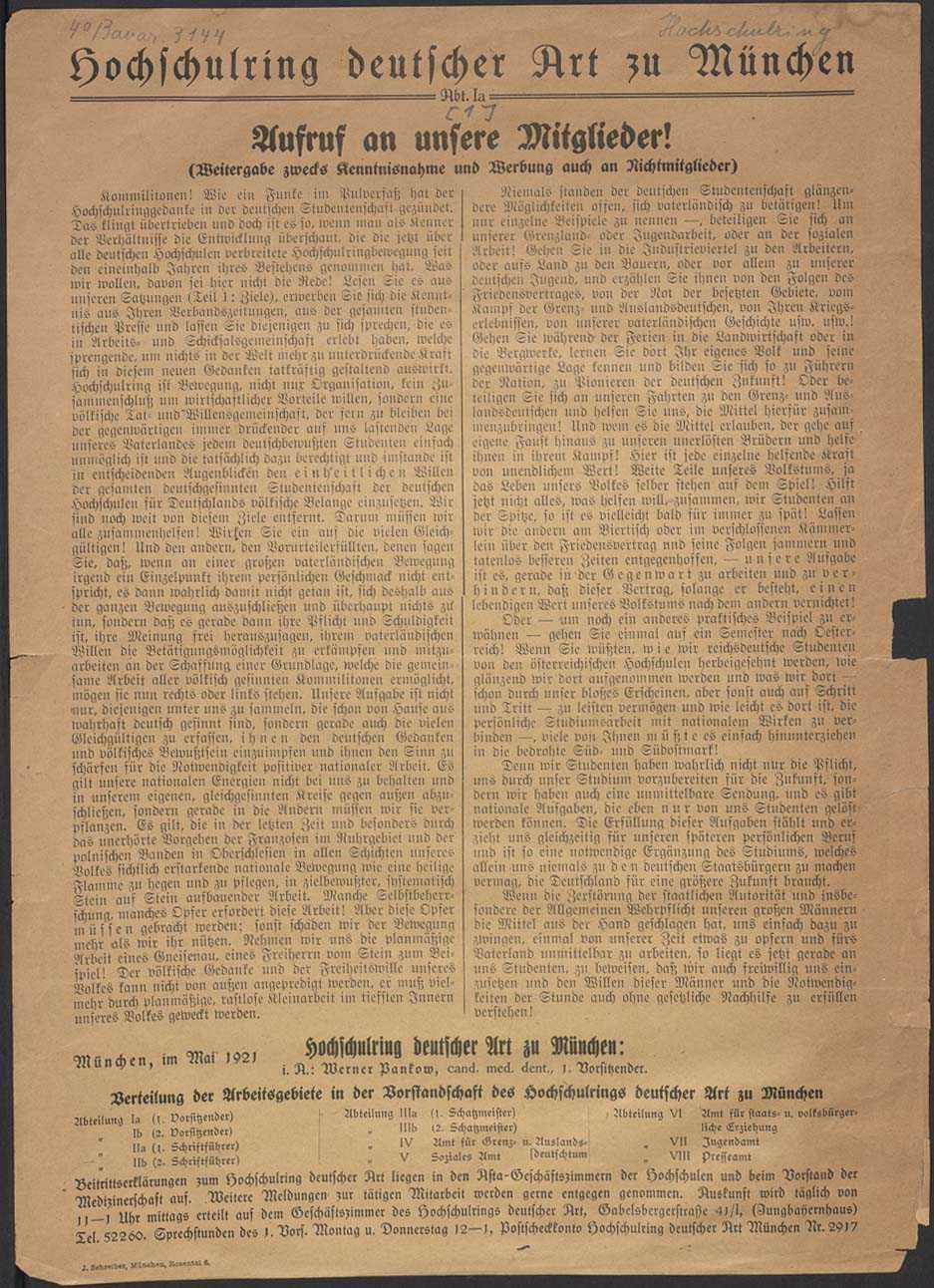 Flugblatt des "Hochschulrings deutscher Art zu München" (Mai 1921). (Bayerische Staatsbibliothek, 4 Bavar. 3144-Ia,1)