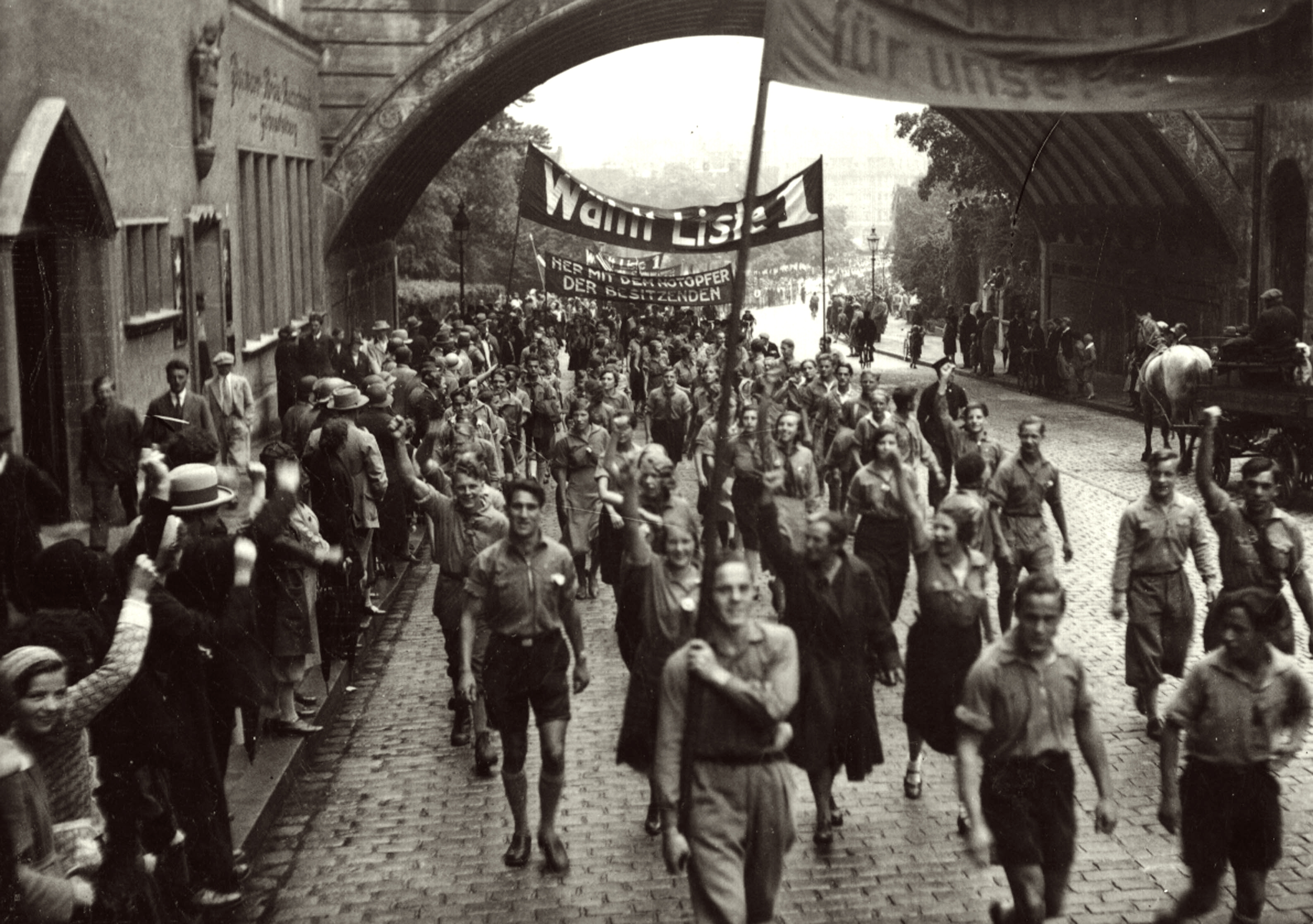 Die Eiserne Front demonstriert am 3. Juli 1932 vor der Gebsattelbrücke in München. Vorne in der Mitte mit geballter erhobener Faust geht die Landtagsabgeordnete Rosa Aschenbrenner (SPD). (Archiv der Münchner Arbeiterbewegung)