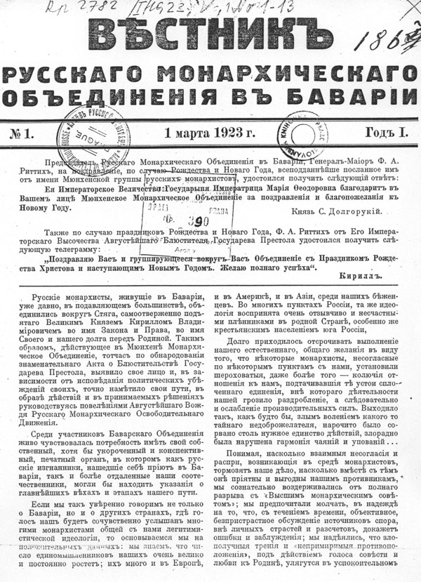 Titelblatt von Vestnik russkago monarchicesjago obedeninenjia v Bavarii [Mitteilungsblatt der russischen monarchistischen Vereinigung] vom März1923