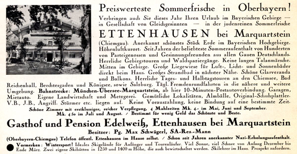 Werbung für "judenfreie Sommerfrische" im oberbayerischen Ettenhausen. (aus: Besucht Bayern die Heimat Adolf Hitlers. Ein Werbeheft, München 1933)