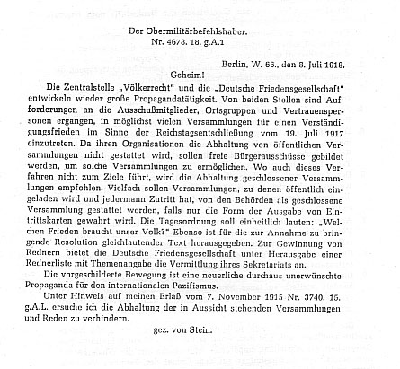 Anordnung des Obermilitärbefehlshabers von Stein zur Überwachung der Friedensbewegung während des Ersten Weltkriegs [aus: Sabine Hering/Cornelia Wenzel [Hg], Frauen riefen, aber man hörte sie nicht Die Rolle der deutschen Frauen in der internationalen Frauenfriedensbewegung zwischen 1892 und 1933, Kassel 1986,12]