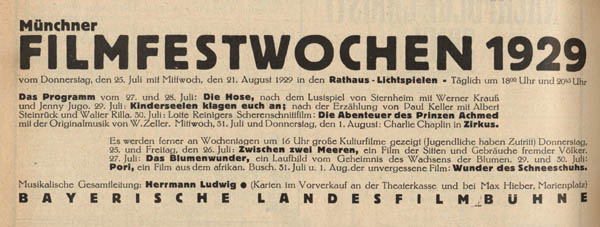 Anzeige für die Filmfestwochen 1929. (aus: Münchener Vergnügungsprogramm, 27. Juli 1929 mit 3. August 1929)
