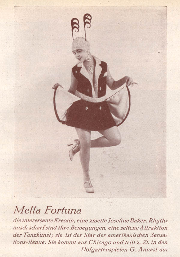 Das Münchener Vergnügungsprogramm bewarb 1928 die Tänzerin Mella Fortuna als "eine zweite Josefine Baker". Josefine Baker (1906-1975) wurde im Jahr darauf untersagt, in München aufzutreten. (aus: Münchener Vergnügungsprogramm vom 21 Oktober 1928 mit 27. Oktober 1928)